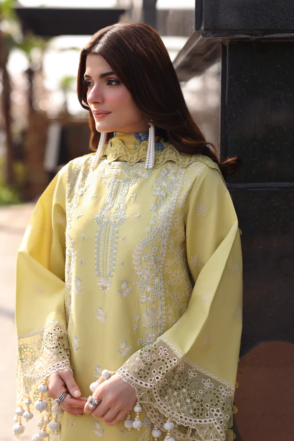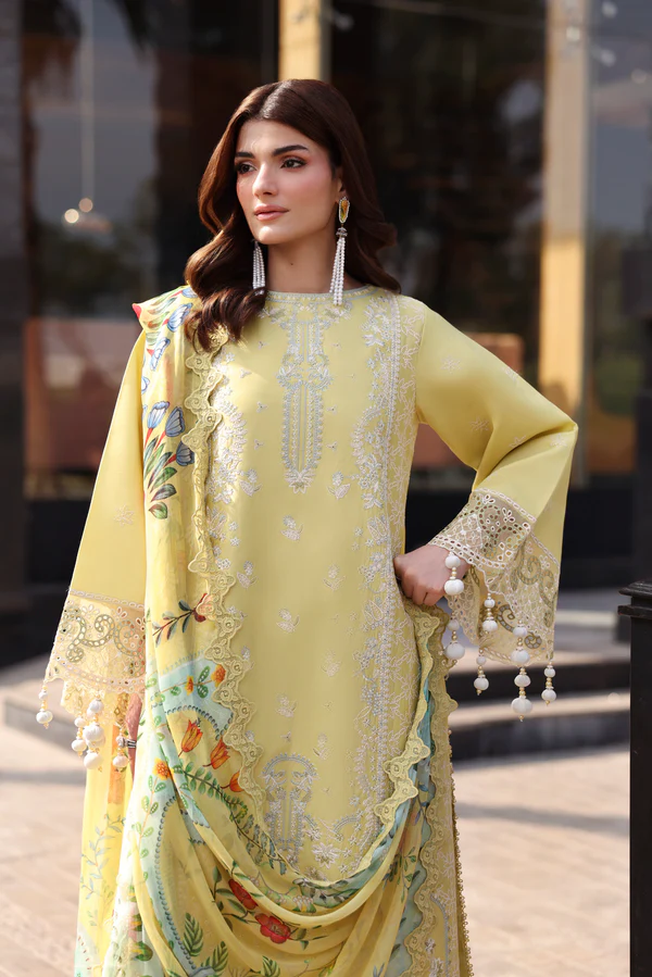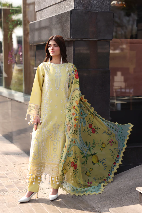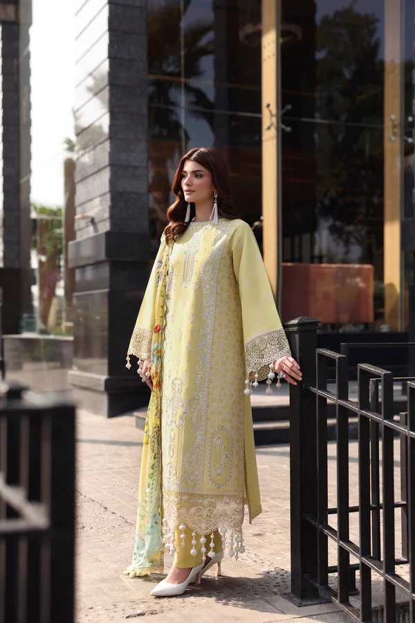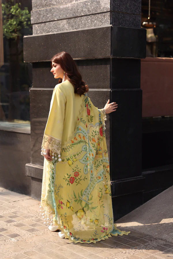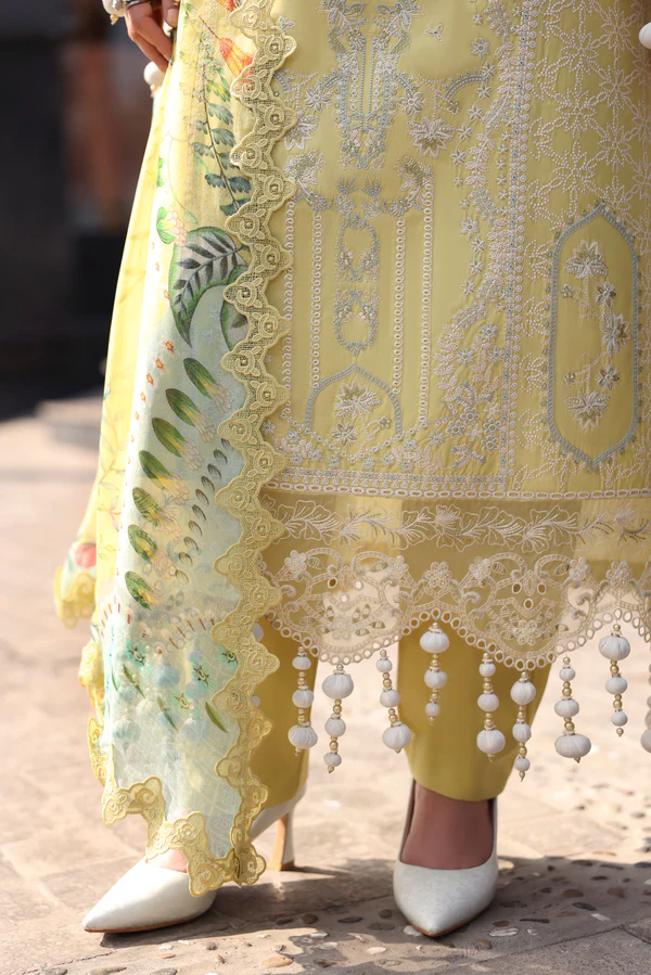 Shirt Dyed Embroidered Front Dyed Embroidered Sleeves Dyed Plain Back Add On Embroidered Hem Border For Front Embroidered Sleeves Lace Dupatta Digital Printed Pure Chiffon Trouser Dyed Plain Cotton Trouser