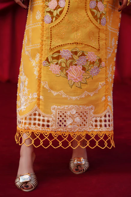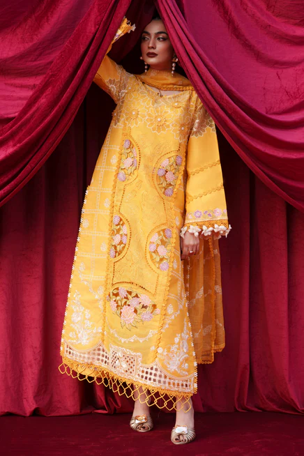 Embroidered Lawn Front  (1 Pc) Dyed Lawn Plain Back (0.84 Meter) Embroidered Lawn Sleeves (0.55 Meter) Embroidered Neckline (1 Pc) Embroidered Sleeve Border (0.90 Meter) Embroidered Front Border (1 Pc) Embroidered 3D Flowers (1 Set) Embroidered Slub Net Dupatta (2.50 Meter) Dyed Cambric Trouser (2.50 Meter)