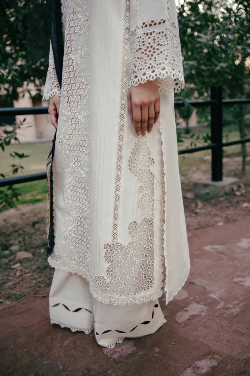 Schiffli Embroidered lawn center front panel Dyed lawn side panels Lawn dyed back Schiffli Embroidered lawn sleeves Schiffli Cutwork corners for hem (2pcs) Cambric dyed trousers Sublimation printed monarch dupatta 2.5 mtrs