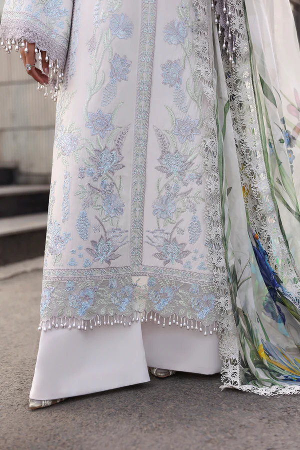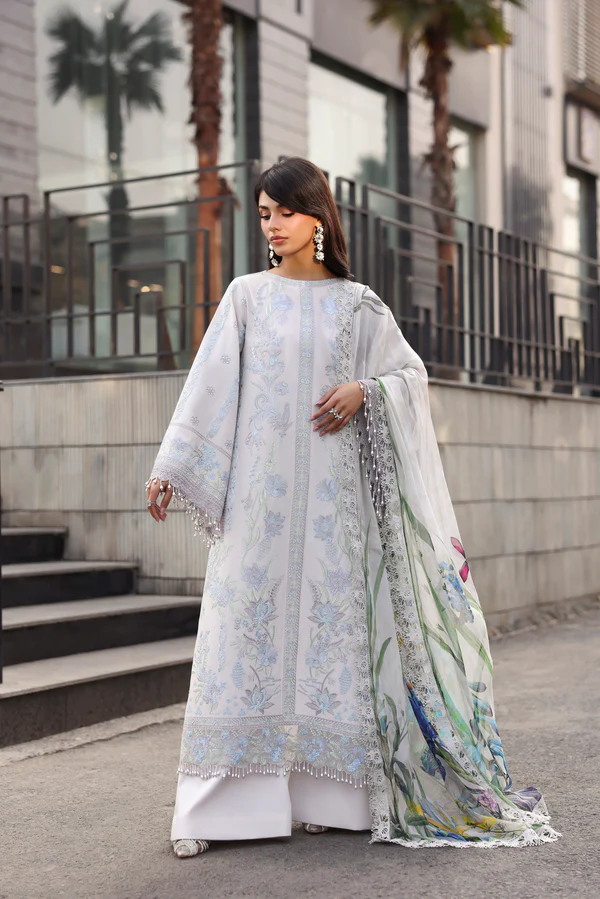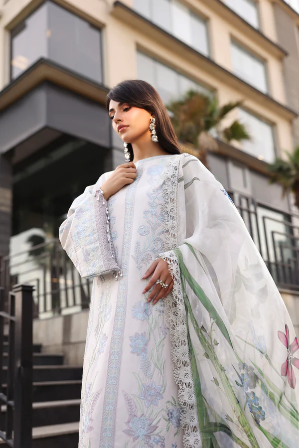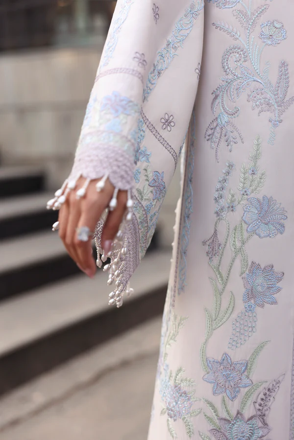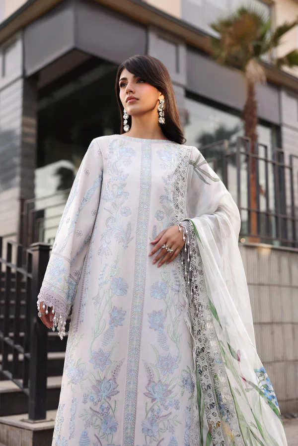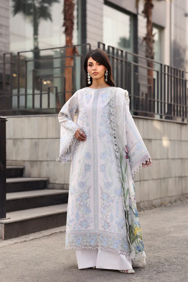 Shirt Dyed Embroidered Front(Left & Right) Dyed Embroidered Sleeves Dyed Plain Back Add On Embroidered Hem Border For Front Embroidered Sleeves Lace Dupatta Digital Printed Pure Chiffon Trouser Dyed Plain Cotton Trouser