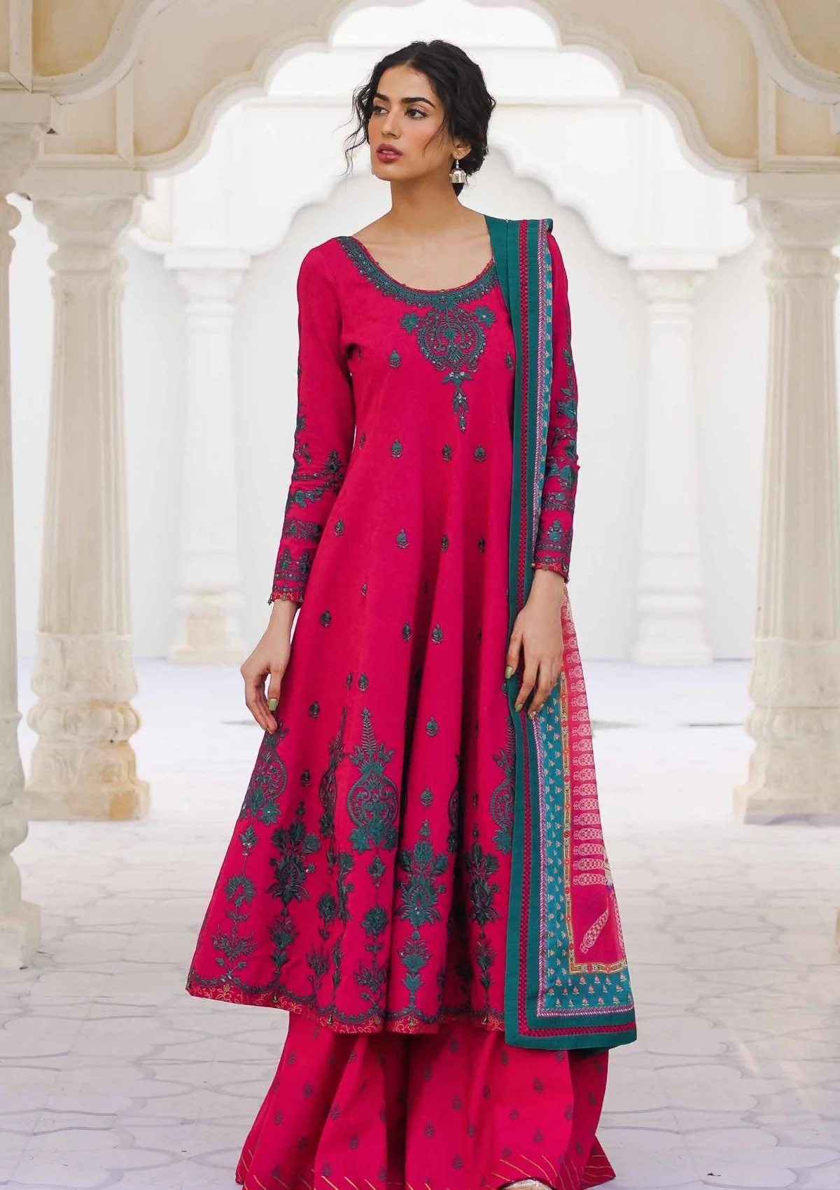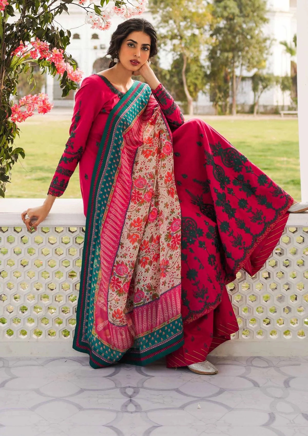 Embroidered Self jacquard Front Back 2.8 Yards Embroidered Self jacquard Sleeve 0.7 Yard Embroidered Neck 1 Pcs Printed Border on Fabric Printed Silk Dupatta 2.6 Yard Printed cambric trouser 2.15 Yard